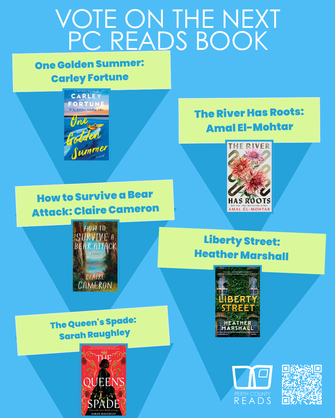 Perth County Reads brings our community together through the joy of reading. This annual program celebrates books, highlights Canadian authors, and inspires meaningful conversations. Everyone in Perth County is invited to read the same book, share their thoughts, join engaging events, and connect with the author in person.